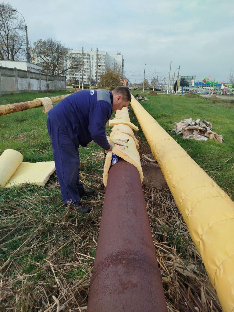 Сотрудники ГУП РК «Крымтеплокоммунэнерго» утепляют теплотрассу ДУ 325 мм идущую от котельной расположенной на ул. Свердлова, 57 в г. Керчь.
