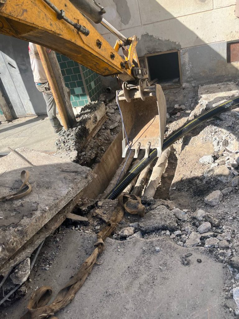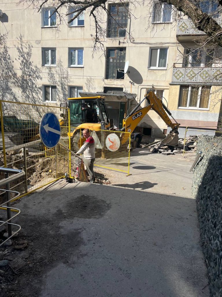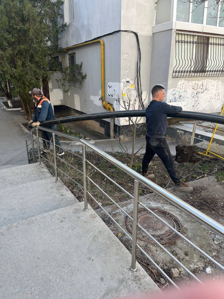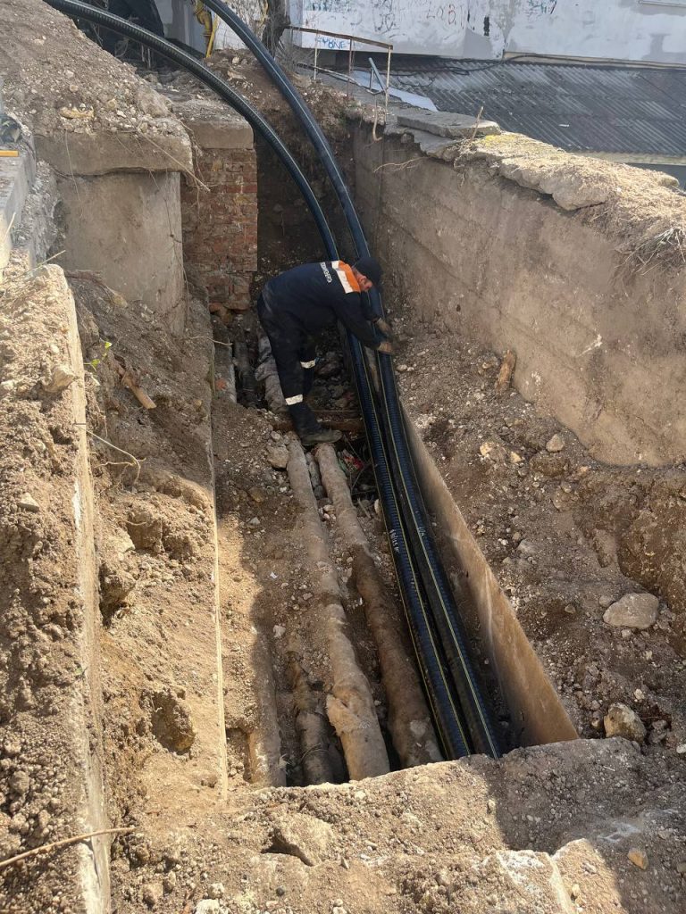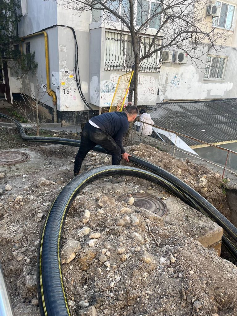 Сотрудники ГУП РК «Крымтеплокоммунэнерго» ремонтируют теплотрассу ДУ 100 мм на ул. Мате Залки,15-17 в г. Симферополь. Устанавливают пластиковые трубы.